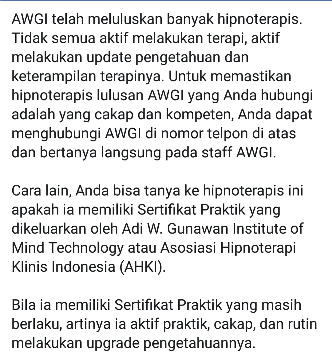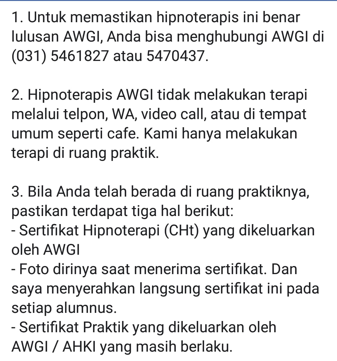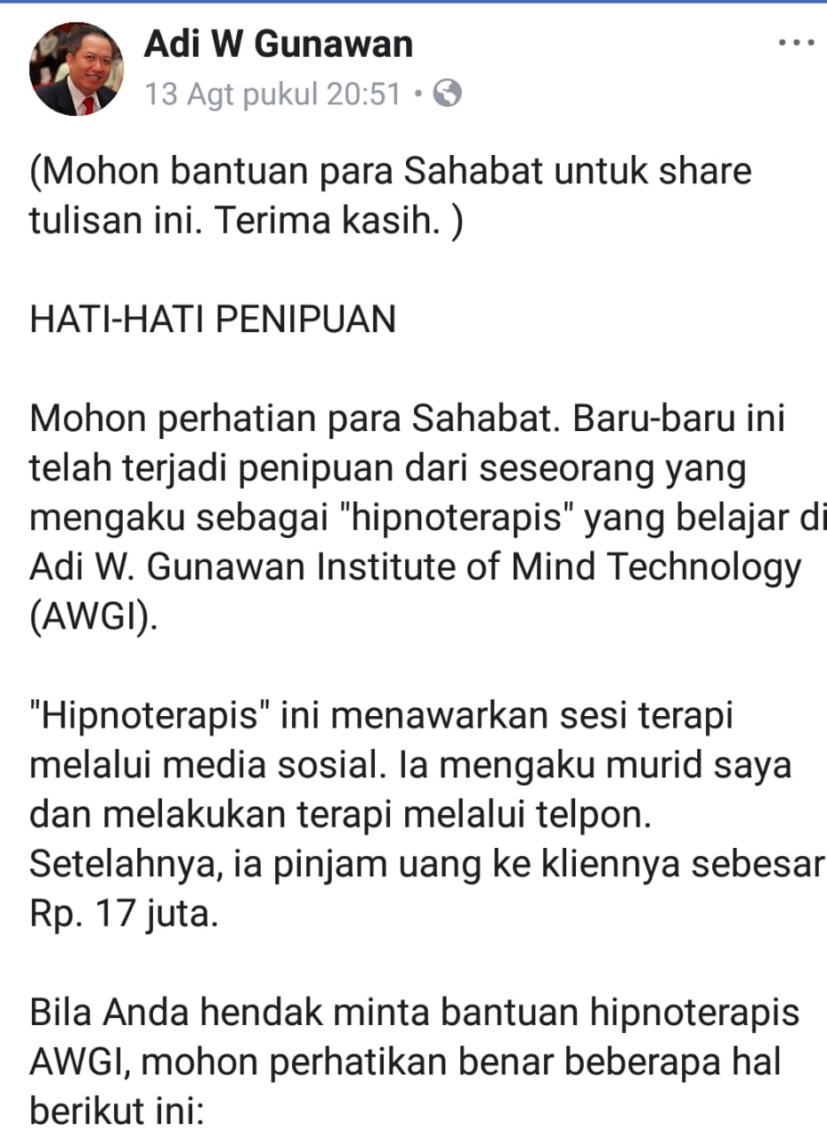 Disadur dari facebooknya pak Adi W Gunawan, mengenai penipuan hipnoterapi, semoga hal ini tidak terulang kembali dan kita selalu waspada.